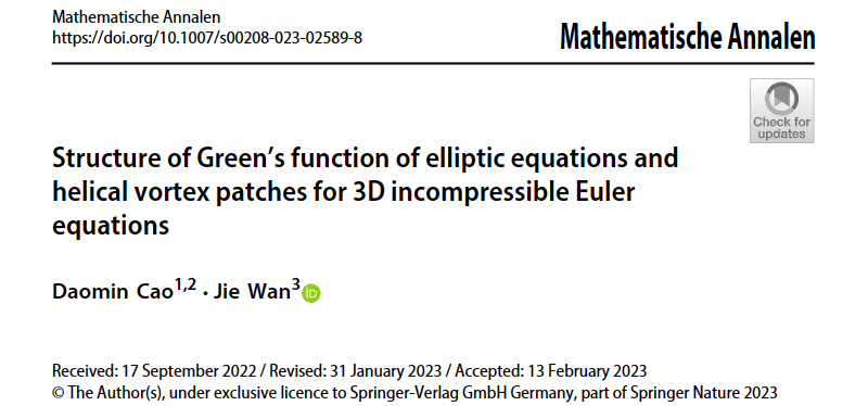 编辑:王欢 审核:张希承 阅读次数:日前,北京成品人和一品二品的区别数学与统计学院万捷副研究员在国际学术期刊《Mathematische Annalen》发表题为“Structure of Green’s function of elliptic equations and helical vortex patches for 3D incompressible Euler equations”的研究论文。该论文给出了散度型二阶椭圆算子Green函数的展开公式,并由此证明了无限管道区域上三维不可压缩欧拉方程集中到涡丝方程的螺旋对称涡补丁解的存在性和轨道稳定性。某种程度上给出了涡丝猜想在螺旋对称情形下的一个证明。