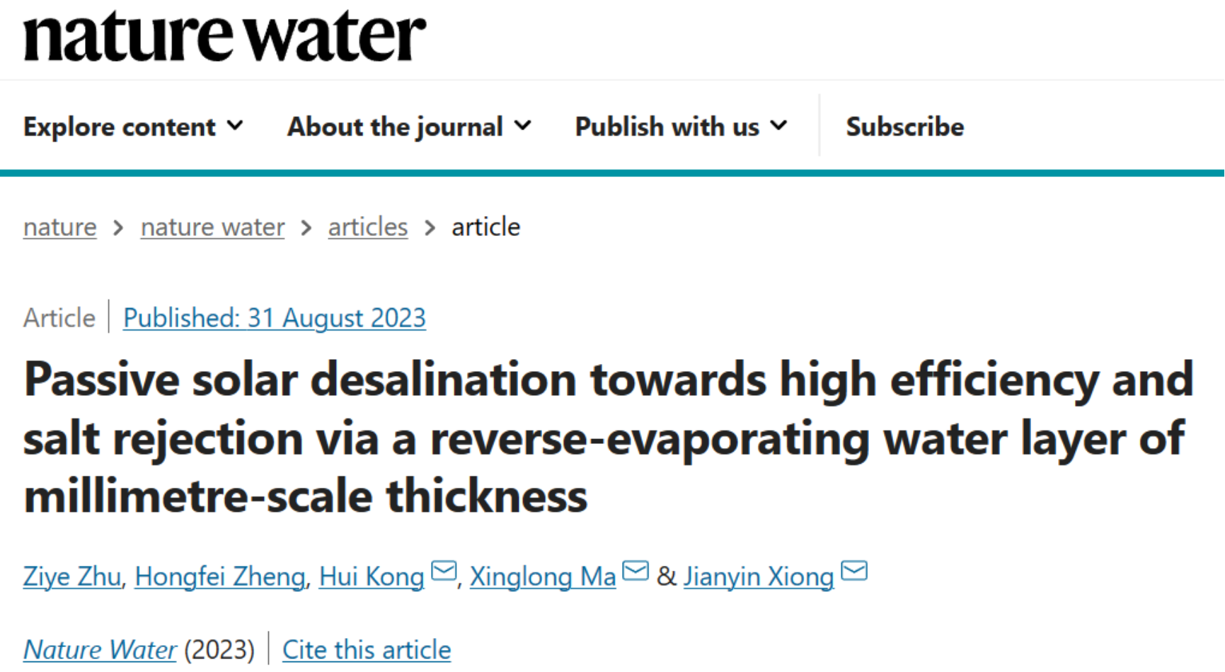 论文详情:Ziye Zhu, Hongfei Zheng, Hui Kong*, Xinglong Ma*, Jianyin Xiong*. Passive solar desalination towards high efficiency and salt rejection via a reverse-evaporating water layer of millimetre-scale thickness. Nature Water (2023). http://doi.org/10.1038/s44221-023-00125-1