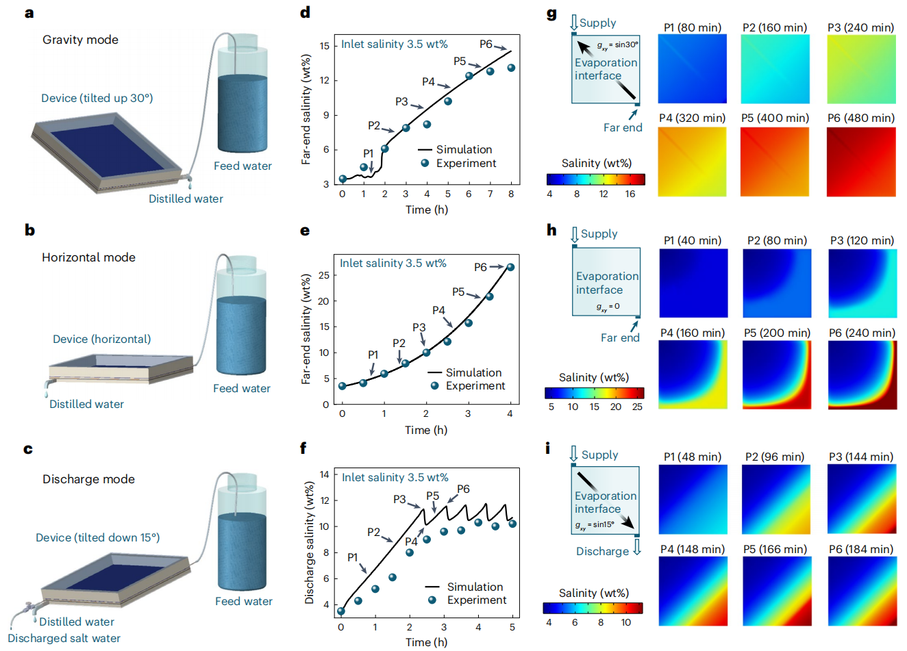 图2. 单级装置实验与仿真 (a)-(c) 三种运行模式;(d)-(f) 盐度实验结果;(g)-(i) 蒸发表面盐度仿真结果