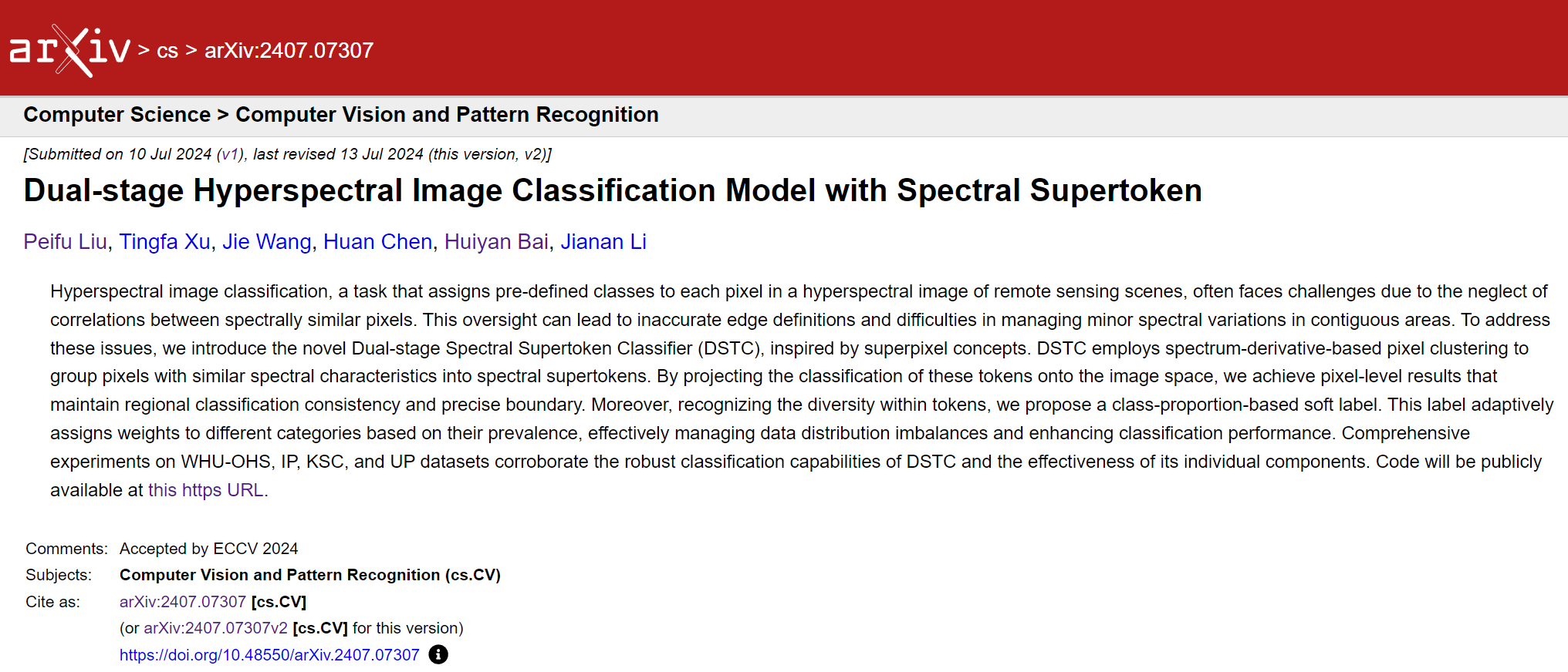 论文详情:P. Liu, T. Xu, J. Wang, H. Chen, H. Bai, and J. Li, Dual-stage Hyperspectral Image Classification Model with Spectral Supertoken, in European Conference on Computer Vision, doi: 10.1007/978-3-031-72754-2_21.