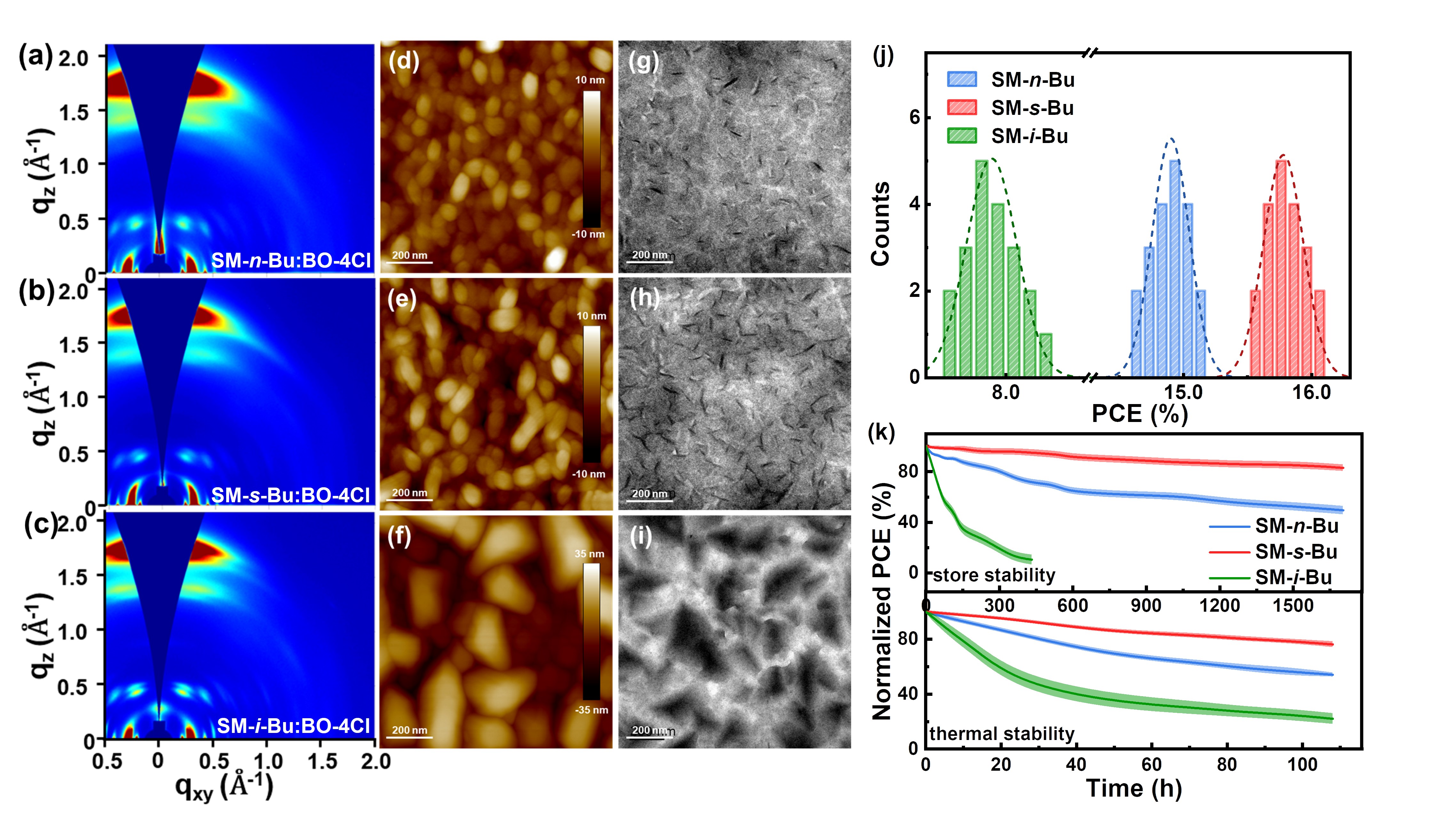 相应的模型化合物的单晶结构展现出明显的差异性。与另外两个晶体的层状滑移堆积模式相比,末端烷基异构分叉点最临近罗丹宁骨架的晶体结构(T- s -Bu)具有更紧密的鱼骨状堆积模式,表明末端烷基链异构化调控可以精细调控分子间晶体堆积模式。尽管这些小分子异构化给体材料具有相似的吸收和HOMO/LUMO能级, SM-s-Bu:BO-4Cl共混膜具有更合适的相分离尺寸以及更明显的微晶共存特征(图2),进而促进了更加高且平衡的电子-空穴迁移率以及更弱的电荷复合。因此,基于SM- s -Bu:BO-4Cl的二元全小分子电池获得16.1%的最优光电转换效率,明显高于基于SM- n -Bu:BO-4Cl和SM- i -Bu:BO-4Cl的器件结果,是基于苯并二噻吩-三噻吩类小分子给体材料的全小分子有机太阳能电池的高光电转换效率之一。更重要的是,SM-s-Bu:BO-4Cl电池同时实现了存储 T 80寿命超过1700 h,表明其在获得高效率的同时兼具有出色的存储稳定性。综上,这项工作突破了给体末端基调控的传统思路,强调了末端烷基异构分叉点最临近罗丹宁骨架的策略有助改善晶体填充和调控共混薄膜形态,为实现高效率和稳定性好的全小分子太阳能电池提供了简便可行的新策略。