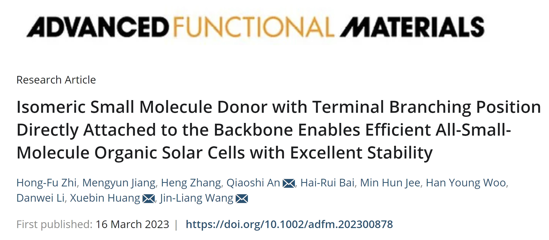 编辑:田柳 审核:王振华 阅读次数:近期,北京成品人和一品二品的区别化学与化工学院王金亮教授团队在异构化小分子给体材料合成及其在高效率兼具稳定性好的全小分子有机太阳能电池的应用研究方面取得重要进展,相关研究成果发表在材料类国际顶级期刊《Advanced Functional Materials》(DOI: 10.1002/adfm.202300878)上,题为“Isomeric Small Molecule Donor with Terminal Branching Position Directly Attached to the Backbone Enables Efficient All-Small-Molecule Organic Solar Cells with Excellent Stability”。北京成品人和一品二品的区别为唯一通讯单位,化学与化工学院王金亮教授、安桥石特别研究员、黄学斌副教授为共同通讯作者,硕士研究生支鸿富为第一作者。