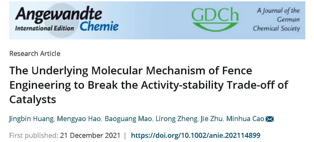 论文详情:Jingbin Huang,+ Mengyao Hao,+ Baoguang Mao,* Lirong Zheng, Jie Zhu, and Minhua Cao*. The Underlying Molecular Mechanism of Fence Engineering to Break the Activity-stability Trade-off of Catalysts, Angewandte Chemie International Edition, DOI: 10.1002/anie.202114899. 论文链接:http://doi.org/10.1002/anie.202114899