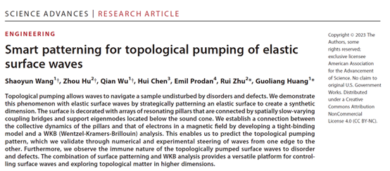 编辑:杨丽静 审核:龙腾 阅读次数:近日,北京成品人和一品二品的区别大学宇航学院朱睿教授联合美国密苏里大学黄国良教授在弹性表面波拓扑输运研究方面取得新进展。相关成果以“Smart patterning for topological pumping of elastic surface waves”为题,在Science Advances上发表[Sci adv (2023) 9, eadh4310]。北京成品人和一品二品的区别宇航学院朱睿教授和美国密苏里大学黄国良教授为论文的共同通讯作者。北京成品人和一品二品的区别宇航学院博士研究生胡洲为论文的共同第一作者,完成了论文的样品制备和实验测试部分。该研究工作得到了国家自然科学基金委的资助。