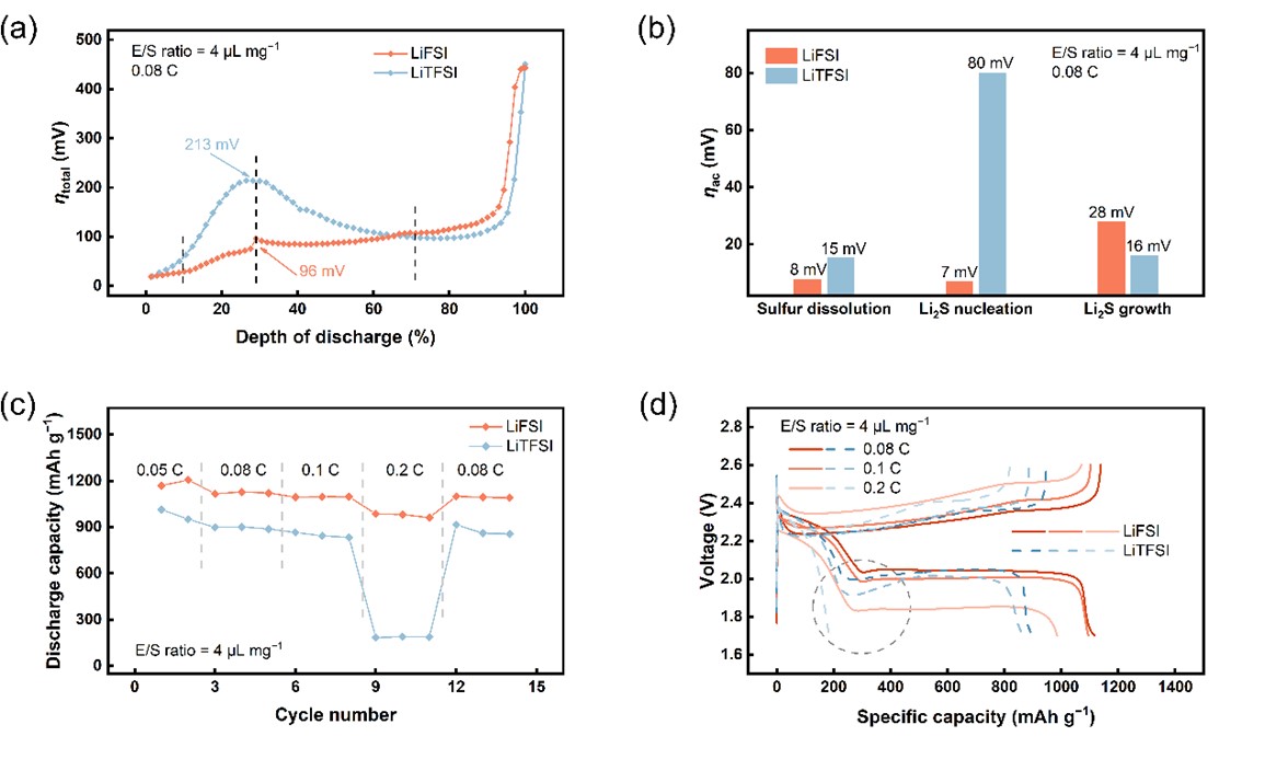 图4. 使用LiFSI电解液的贫液锂硫电池动力学分析和全电池性能。