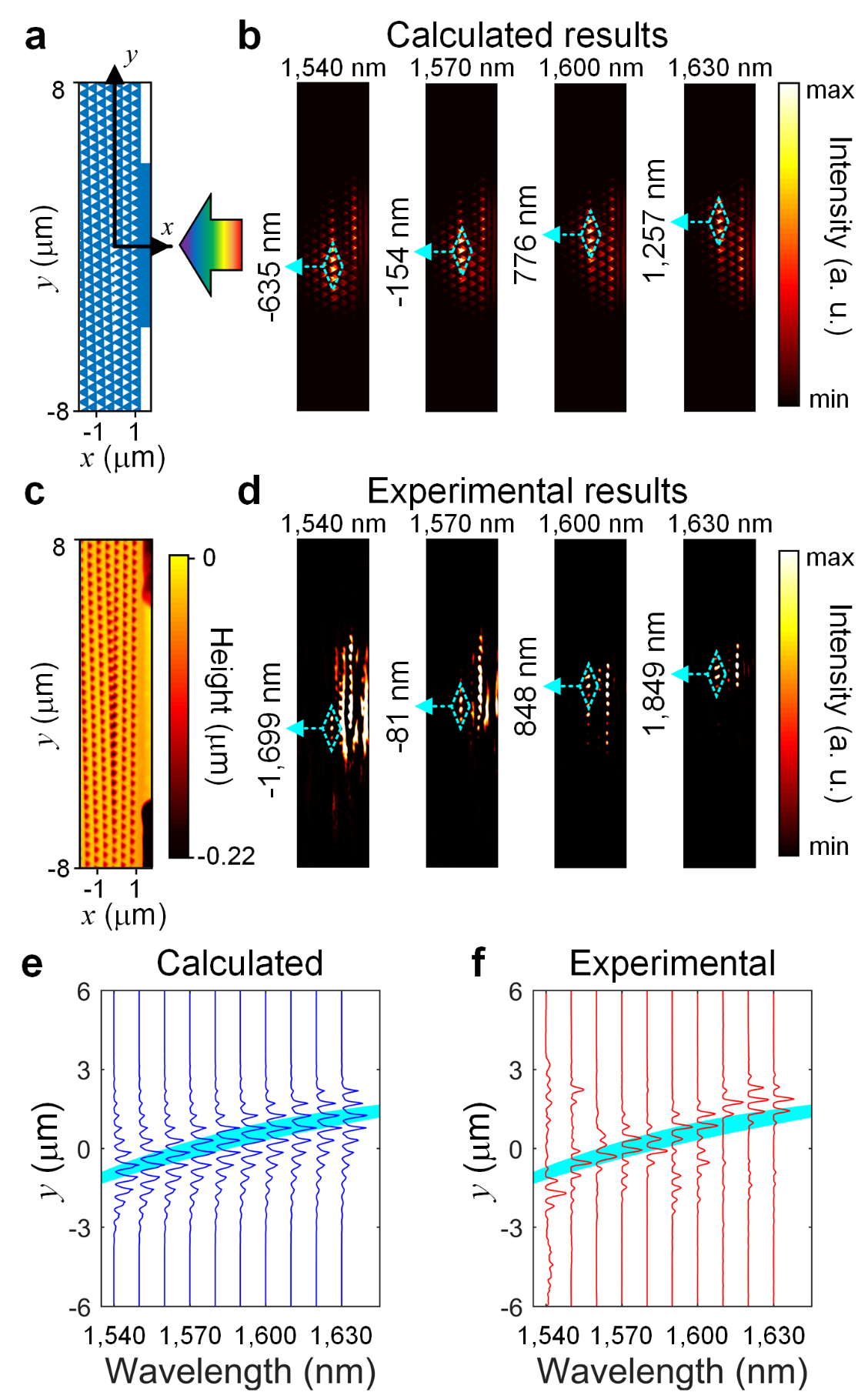 图2 (a)样品设计图示例;(b)计算的不同波长在合成维度光子晶体表面的光强分布;(c)样品原子力显微镜形貌图;(d)实验测得的不同波长在合成维度光子晶体表面的表面光强分布,不同波长被囚禁在界面不同晶格位置。