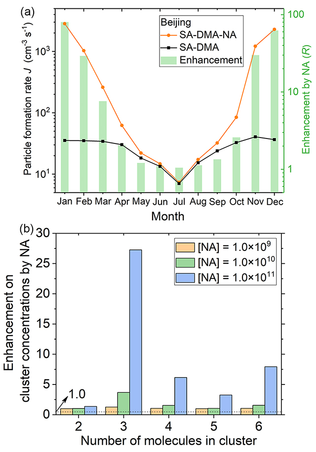 图1. 在污染大气边界层,硝酸(NA)可参与硫酸(SA)-二甲胺(DMA)成核过程
