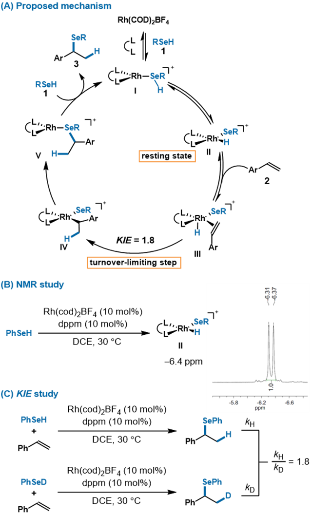 在一系列机理实验例如核磁实验、氘代实验等研究的基础之上,证实了氢硒化反应机理的决速步骤是烯烃迁移插入Rh-H键(图3)。