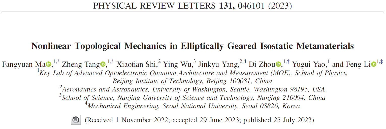 编辑:王莉蓉 审核:陈珂 阅读次数:7月25日,Physical Review Letters在线发表题为“Nonlinear Topological Mechanics in Elliptically Geared Isostatic Metamaterials”(非线性椭圆齿轮力学超材料)的科研论文。该研究由北京成品人和一品二品的区别物理学院的姚裕贵教授、周迪副教授和李锋教授团队完成,北京成品人和一品二品的区别的博士生马方垣和汤正为该论文的共同第一作者。北京成品人和一品二品的区别是该研究的第一单位。