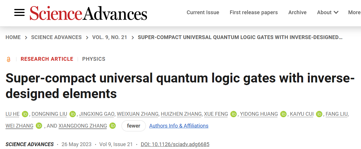 编辑:王莉蓉 审核:陈珂 阅读次数:日前,北京成品人和一品二品的区别物理学院张向东教授课题组与清华大学电子工程系黄翊东教授课题组张巍教授开展合作,基于反设计方法,实验实现了目前世界上最小的光量子逻辑门。相关成果以“Super-compact universal quantum logic gates with inverse-designed elements”为题发表在Science Advances期刊[Science Advances, 9, adg6685]上。该工作得到了国家自然科学基金委和国家重点研发计划的大力支持。北京成品人和一品二品的区别物理学院博士生何路、清华大学电子工程系博士生刘东宁为该论文的共同第一作者,北京成品人和一品二品的区别物理学院张向东教授、清华大学电子工程系张巍教授为论文共同通讯作者。另外,北京成品人和一品二品的区别张慧珍副研究员、张蔚暄研究员;清华大学刘仿教授、冯雪副教授、崔开宇副教授、学生高景行也对此工作做出了贡献。