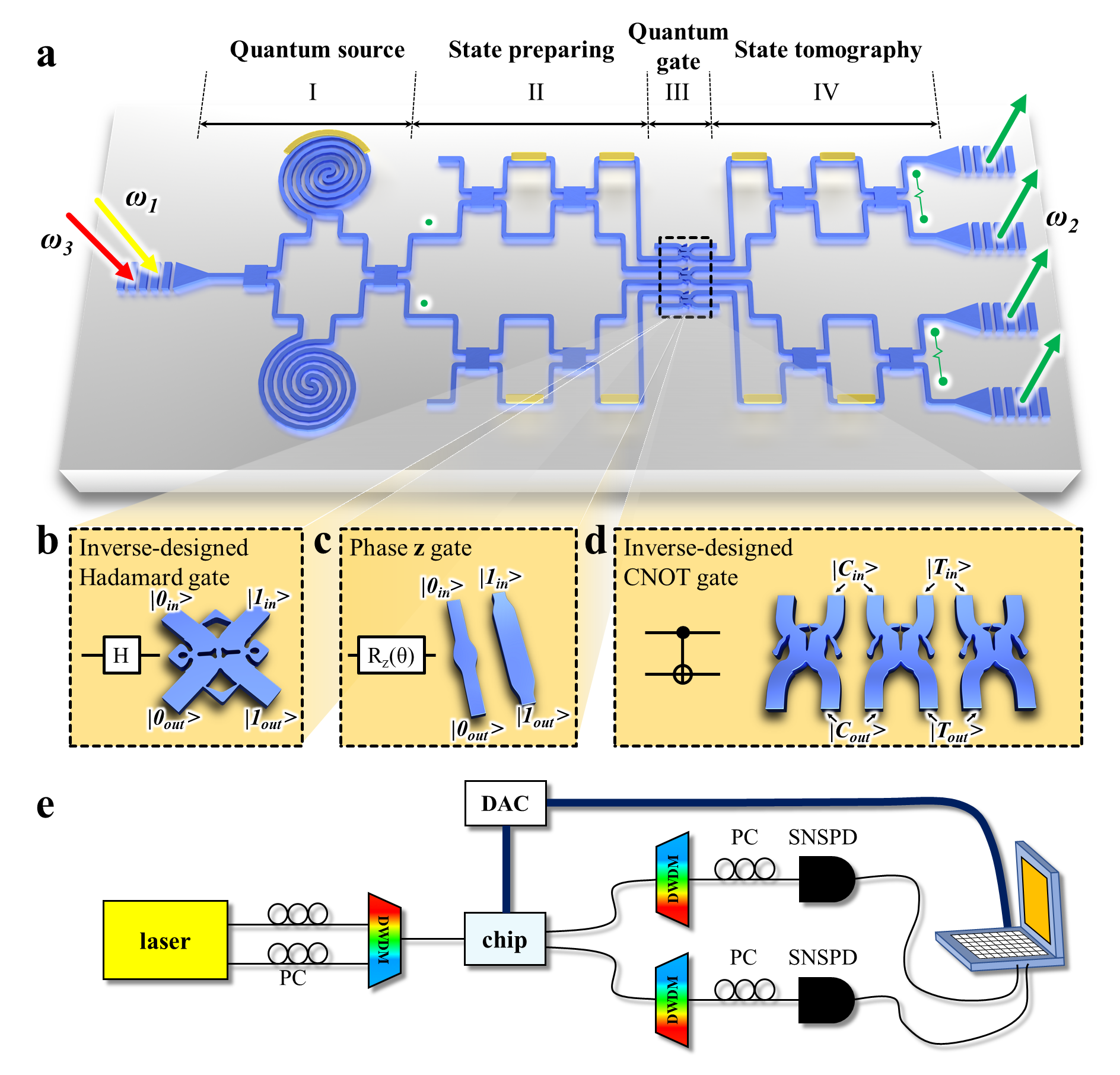 研究人员将量子门及辅助测试系统制备在顶硅厚度为220nm厚的SOI平台上。如图1a所示,该量子芯片由四个模块组成,分别是:(I)量子源,(II)态制备,(III)量子门和(IV)态层析模块。本研究主要关注通过反设计方法制备的超紧凑量子门,包括Hadamard门、相位z门以及CNOT门,分别如图1b-1d所示。