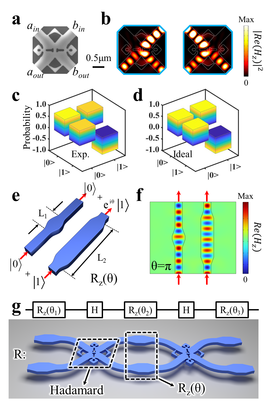 基于这样的Hadamard门,结合相位旋转z门Rz(θ),研究人员构建了任意的单比特量子门R。对于路径编码方案,研究人员通过在光量子态的两条路径之间引入相位差轻松实现Rz(θ)门。如图2e所示,相位z门是由宽度为700nm、长度为L1和L2的加宽波导构成的。当L1≠L2时,在这些波导中的量子态或