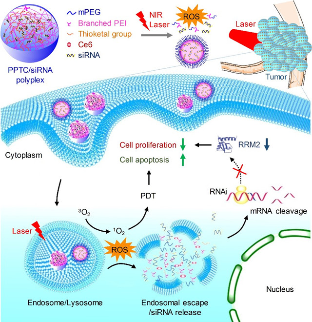 基于以上考量,该研究设计了一种聚乙二醇(PEG)修饰、ROS响应的阳离子聚合物PPTC,该阳离子聚合物可高效负载抗RRM2基因的siRNA药物,形成稳定、均一的PPTC/siRRM2纳米药物体系。RRM2是一种脱氧核糖核酸酶还原亚基,与多种癌症的发生发展密切相关,沉默RRM2可促进肿瘤细胞发生凋亡。该复合物进入到细胞后,在近红外光的照射下能有效降解聚合物、产生ROS,ROS可破坏内涵体膜、促进内涵体逃逸,同时破坏细胞膜使肿瘤细胞发生凋亡。而进入胞质的siRNA抑制RRM2的表达,可有效阻止癌细胞增殖,从而从“促凋亡、抑增殖”双角度实现协同抗肿瘤治疗(图1)。