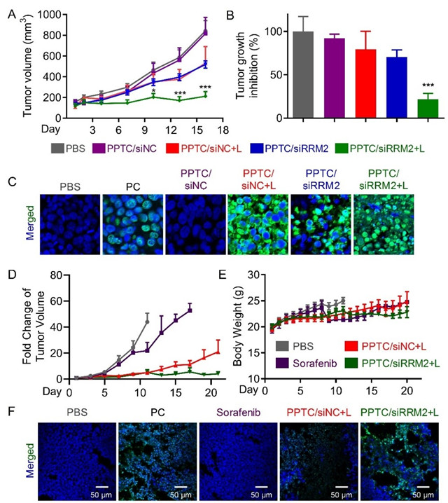进一步,研究人员在小鼠上分别建立了肝癌细胞系异种移植的CDX模型(图3A-C)和肝癌患者癌组织异种移植的PDX肿瘤模型(图3D-F)。研究表明,在这两种肿瘤模型中,PPTC/siRNA药物体系均可有效抑制肿瘤生长,促进癌细胞凋亡。值得注意的是,数据证明该药物体系表现出良好的光动力与siRNA治疗协同效应,相比于单独使用siRNA或单独进行光照处理,二者联合可显著提高RRM2的基因沉默效率,提升小鼠肿瘤生长的抑制效果(图3A-B)。同时,该复合物在细胞和动物体内都展现出了良好的安全性。