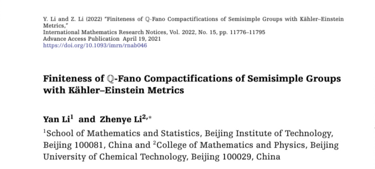 编辑:王欢 审核:张希承 阅读次数:日前,北京成品人和一品二品的区别数学与统计学院教师郦言与北京化工大学数理学院教师李振业在期刊《International Mathematics Research Notices》上合作发表题为《Finiteness of Q-Fano Compactifications of Semisimple Groups with Kähler–Einstein Metrics》的研究论文。该研究证明了对于连通、半单复Lie群G,具有Kähler-Einstein度量的Q-FanoG-紧化空间只有至多有限个。
