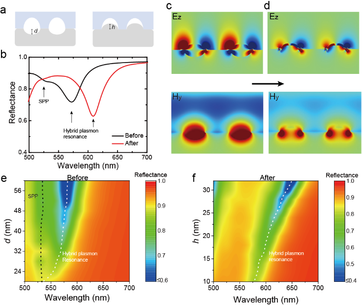在本工作中,研究团队进一步发展了金属钠热辅助液态旋涂技术,通过多物理场模拟和实验探究发现了液态钠与石英多孔结构在接触过程中的非浸润中间态(图1),研究人员通过快速冷却技术将浸润过程中断,使得这种纳米反穹顶结构定形,再经过后续对器件进行加热熔化,实现反穹顶结构向穹顶结构的纳米形变。理论分析证明,这种纳米形变能够引起器件反射光谱的变化(图2),在石英、钠、气体三者的界面处,形成了表面等离激元与间隙等离激元共振的模式混合,随着形变的发生和气体间隙的缩小,混合模式的共振增强并产生红移。