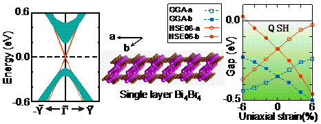 编辑:物理学院 周格羽 阅读次数:图1:单层Bi4Br4的结构示意图(中),边缘态电子结构(左),以及体能隙随单轴应力的变化(右)。