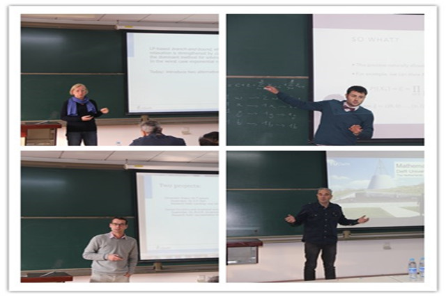 21日上午,来自TU Delft 的Fred Vermolen、Karen Aardal 、Wolter Groenestijn和Pasquale Cirillo 四位教授为学院师生带来精彩的学术报告。报告会围绕着生物制药模型中的数值挑战、整数最优化、F空间上的维度理论和预警系统四个主题,与我院师生展开热烈的讨论,大大开拓了与会师生的视野,引起了师生的广泛兴趣和共鸣,与会师生深感受益。