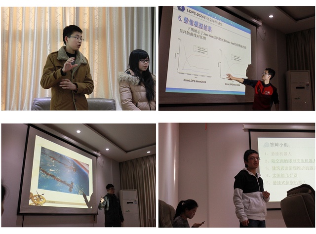 在项目展示环节,各团队着重讲述了立项的背景、开题以来开展的工作和今后的工作方向。张笛团队讲述了他们承担的《机器代理人》和《悬挂式侦查机器人》两个项目,并展示了自己目前做的作品动态效果。高枫团队展示了《陆空两栖球形变胞机器人》和《化学灾害现场检查无人机动平台》两个项目的立项背景、目前项目的进展和参加各项大赛情况。陈虹百讲述了建筑表面清理机器人工作原理和动画演示。张振同学讲述了他们开发太阳能飞机的过程,和参赛的感受。郭志威同学讲述了《轻型层状复合装甲抗弹性能研究》中自己开展的多项研究和实验的过程。刘旺讲述了对《单兵智能探雷系统》小型化和智能化的认识。金诚同学讲述了《大角度矢量推进式水下多用途机器人》经过不断改进,参加创新年会等大赛的情况。钟心亮代表《基于人体工程学的穿戴式增力套装》团队,讲述了后续工作的重点。有的团队侧重于实验数据的分析;有的团队侧重于展示作品的新颖性;有的团队侧重于理论研究的突破。