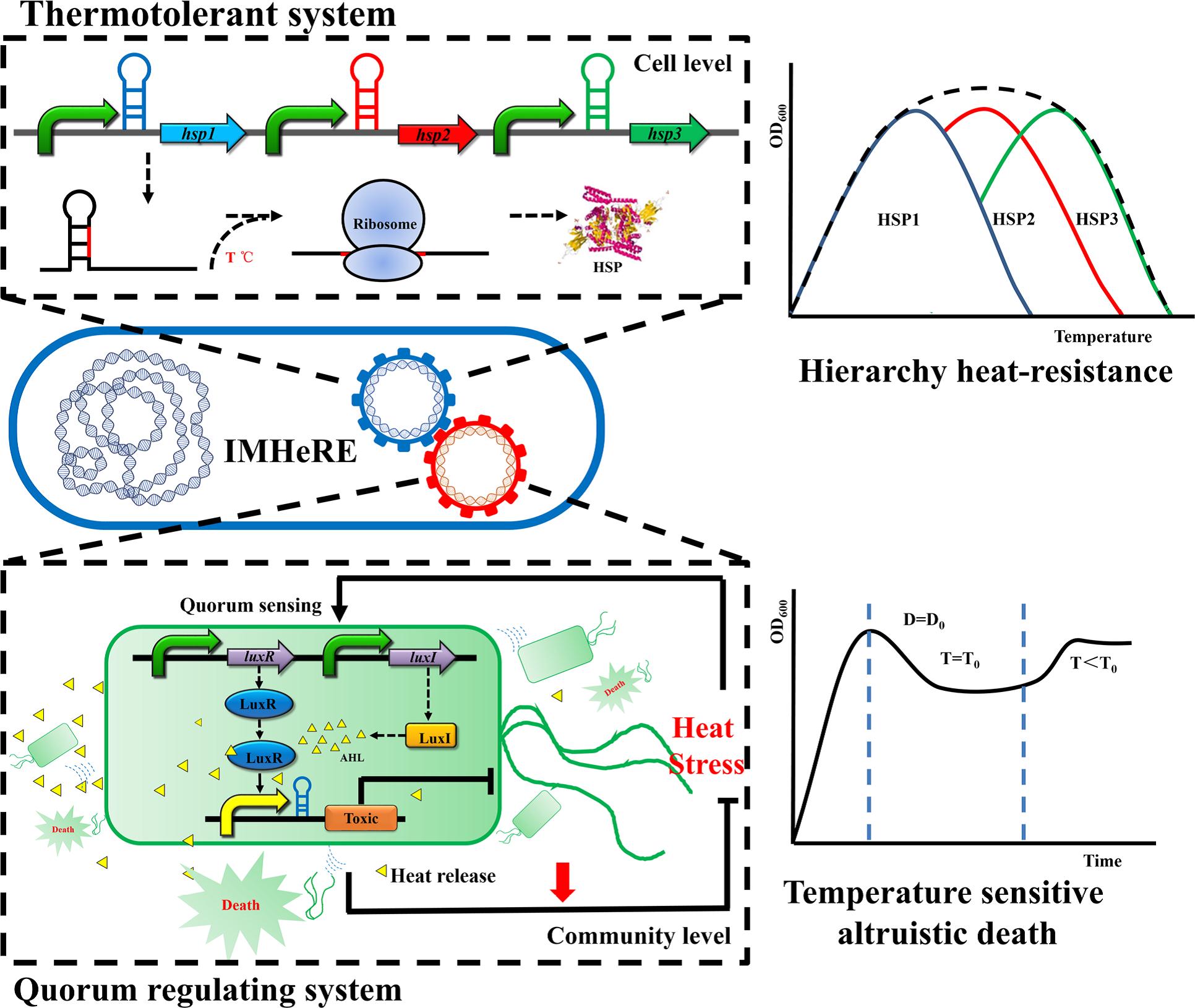 。。微生物智能热量调节引擎的设计及应用(IMHeRE),创造性地实现并大幅度提高了大肠杆菌的耐热能力。IMHeRE主要包括微生物耐热基因线路和数量调控基因线路。耐热线路包括从嗜热微生物中筛选得到的热激蛋白(HSPs)作为耐热功能元件,以及人工设计的RNA温度响应开关作为调控元件,利用对不同温度响应的RNA温度响应开关调控在不同温度下效果最佳的HSPs实现了大肠杆菌的梯级耐热,成功地将大肠杆菌的最适生长温度拓宽到了37-40℃。数量调控线路则利用微生物群体感应系统和RNA温度响应设计的“与”门开关,同时响应温度和细胞密度两个参数来动态开启安全可控的毒性-抗毒性系统(TA),实现微生物的利他性程序化死亡,减少了代谢热的释放同时提高了营养物质的利用率, 从而在菌群层面上提高了微生物适应热胁迫的能力。最后,通过两个系统的协同作用,IMHeRE提高了大肠杆菌对特定高温以及高温波动的适应性与鲁棒性。将该引擎应用于赖氨酸40℃高温发酵,发现赖氨酸产量较对照组提高了5倍,IMHeRE显著的改善了赖氨酸菌株在高温下的生产能力,提高了生产效率、降低控温能耗。另外,由于提高了发酵温度,还可以节省糖化步骤之后的冷却费用。
