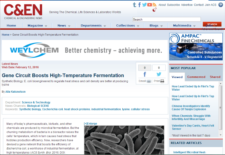 。。该成果发表在国际合成生物学顶级刊物美国化学学会ACS Synthetic Biology(2016,DOI:10.1021/acssynbio.5b00158)上,并被C&EN在2016年2月作为重要科研进展进行新闻报道(http://cen.acs.org/articles/94/web/2016/02/ Gene-Circuit-Boosts-High-Temperature.html?type=paidArticleContent, 图2)。该方法也已申请国家发明专利(CN105002188A)。