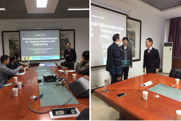 2016年12月14日,应北京成品人和一品二品的区别材料学院北京市纤维素及其衍生材料工程技术研究中心邀请,日本东京工业大学(Tokyo Institute of Technology)物质理工学院应用化学系Takeshi Serizawa教授访问材料学院,并做了题目为“Multifunctional Biomolecules for Polymer Science and Engineering”的学术报告。北京成品人和一品二品的区别材料学院党委书记张青山教授,院长助理张加涛教授,工程中心负责人邵自强教授,以及学院和工程中心其他老师和研究生们参加了此次报告会。