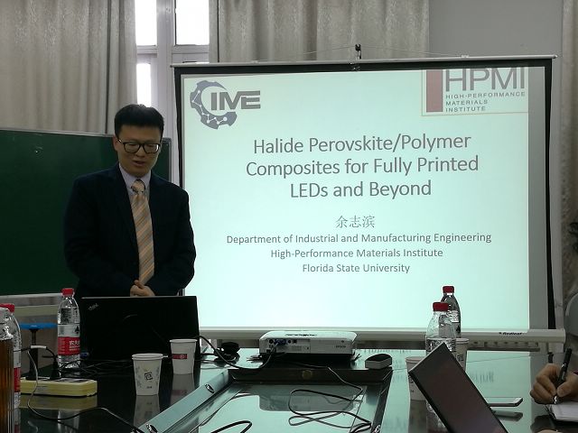 2016年12月29日,佛罗里达州立大学工业工程和制造系余志滨博士应邀到北理工材料学院做学术报告,于上午10:00在4号教学楼502会议室面向全院师生做了题为“Halide Perovskite/Polymer Composites for Fully Printed Light-Emitting Diodes and Beyond” 的学术报告。该报告会系北理工材料学院“21世纪学科前沿” 系列学术交流活动之一。会议由材料学院钟海政教授主持,材料学院30余学生(包括本科生、硕士和博士研究生)聆听了精彩报告。