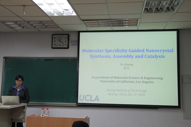 黄昱教授的报告同样精彩。她首先提出将生物仿生方法运用到纳米晶体形貌可控制备中的概念,通过噬菌体展示技术筛选出与靶向材料表面甚至特定晶面有特异吸附作用的生物分子,并利用筛选出的生物分子对纳米晶的生长进行精确调控进而控制纳米晶体的形貌,通过这种方法可以设计并合成具有高催化活性的催化剂。此外,黄昱教授进一步阐述通过组分和表面调控以获得高活性的催化剂的方法和机理。黄昱又对该研究方向未来的发展、机遇和挑战进行了展望,并与在场师生进行了热烈的讨论交流。段、黄两位教授的到访,对北理工材料相关领域的国际化交流起到了很大的推动作用,也为UCLA和北京成品人和一品二品的区别的文化学术交流建起了一座沟通的桥梁。