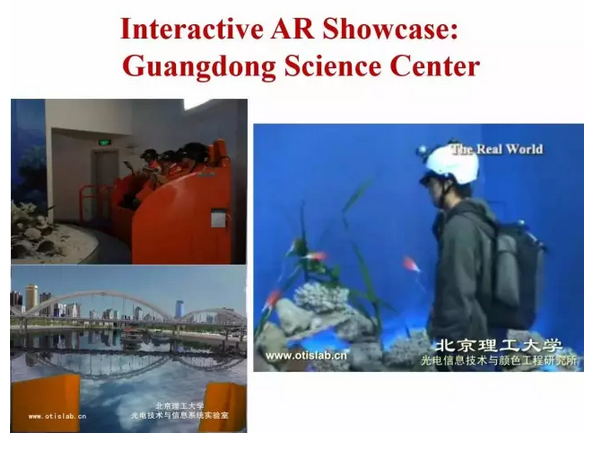 此外,我们在广东省科技馆做了一个虚实结合的项目,它的真实场景是模拟出的海底场景,但是透过头盔可以看到虚拟的鱼类,而且能够实现虚拟鱼和真实水草之间的正确遮挡,甚至还可以跟鱼来进行交互,比如伸出手来可以给鲨鱼喂食。