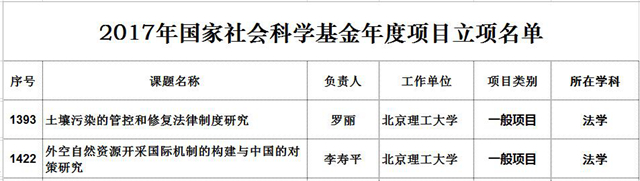 2017年6月16日,全国哲学社会科学规划办公室公示了2017年国家社科基金年度项目立项名单,北京成品人和一品二品的区别法学院罗丽教授的“土壤污染的管控和修复法律制度研究”、李寿平教授的“外空自然资源开采国际机制的构建与中国的对策研究”获得年度一般项目立项。