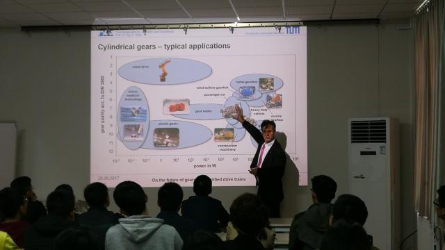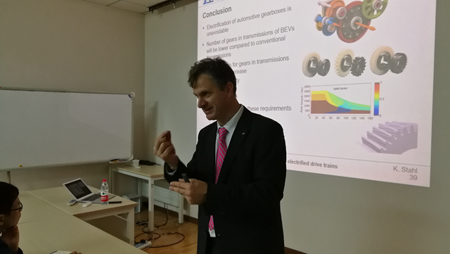 编辑:鄂嵋 审核:左正兴 席军强 阅读次数:近日,德国慕尼黑工业大学机械系教授、德国齿轮研究中心(FZG)主任Karsten Stahl教授访问机械与车辆学院并开展学术交流活动。访问期间,Stahl教授做了题为“On the future of gear in electrified drive trains”的学术报告。Stahl教授重点介绍了齿轮传动在当代乘用车的应用,在此基础上介绍了电动车所用齿轮传动,设计方法,齿轮在电动车中应用的必要性,存在的问题、发展趋势,特别是结合与世界著名车企BMW合作进行电动车研发过程中齿轮传动所要解决的功率密度问题、效率问题和噪声的问题。Stahl教授报告内容丰富,讲述生动,引起了与会师生的浓厚兴趣,同学们就报告内容进行了深入讨论。通过相关领域国际前沿知识的介绍,有助于拓展研究生的国际视野、夯实专业基础、提高专业学习兴趣。