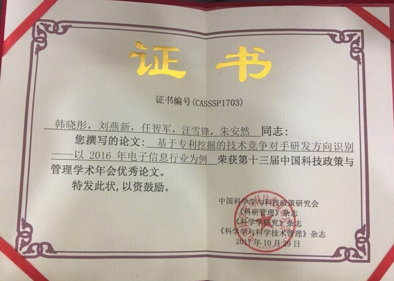 与会期间,北理工汪雪锋教授、郭颖副教授与国内学者进行了广泛学术交流,博士生韩晓彤、乔亚丽及硕士生廉翔鹏、侯雨佳和杨雪梅分别做论文汇报。韩晓彤的获奖论文“基于专利挖掘的技术竞争对手研发方向识别——以2016年电子信息行业为例”由北京成品人和一品二品的区别知识管理与数据分析实验室和中国专利信息中心(刘燕新、任智军)合作撰写,主要内容是利用申请专利与失效专利数据,构建技术竞争对手研发方向识别方法,为企业制定研发策略提供参考。