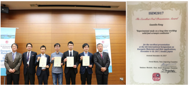 编辑:钟艳玲 审核:武志文 阅读次数:日前,第六届含能材料及其应用国际研讨会(The 6th International Symposium on Energetic Materials and their Applications,ISEM 2017)在日本仙台召开,北京成品人和一品二品的区别宇航学院推进课题组王宁飞教授、李世鹏教授、隋欣副教授、方冠林博士、官典博士、李周波博士和周海霞博士等应邀参加了会议。此次会议中,我校宇航学院王宁飞教授特邀作为分会场主席主持会议。2015级博士生方冠林(导师:魏志军教授、武志文副教授)撰写的论文 “Experimental study on a long-time working solid-fuel scramjet combustor ”受到评审专家的高度认可,获得优秀口头报告奖(The Excellent Oral Presentation Award),该奖只有五名作者获得。此为我校宇航推进课题组在国际会议上的首次获奖,进一步提升了我校在航空航天领域的影响力。