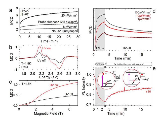 Ag+作为一类新兴掺杂元素,常用于III-V族和II-VI族半导体纳米材料中。Ag+的掺杂引入带间能级,并能够与主体导带形成光学耦合。因为其4d轨道全满,所以Ag+是非磁性的。掺杂引起的荧光归因于光激发的空穴转移到Ag+之后与导带电子的复合。这种光活化过程和Ag+电子构型的相关变化机理仍不清楚。基于此,北京成品人和一品二品的区别张加涛教授课题组与意大利Brovelli教授课题组合作,全面系统的研究了Ag掺杂CdSe纳米晶的激发衰减过程。他们发现一个有趣现象,光生空穴的捕获致使Ag+转变成顺磁性的Ag2+。激子的复合过程与光诱导磁性有着不可分割的关系。他们观察到强烈的光活化磁性和半导体纳米材料的稀磁行为。这一研究结果表明通过非磁性杂质掺杂而诱导的激发过程可以获得光学可转换的磁性纳米半导体材料。实现其光、电、磁学性能有效调控,促进其在光电自旋器件的应用!