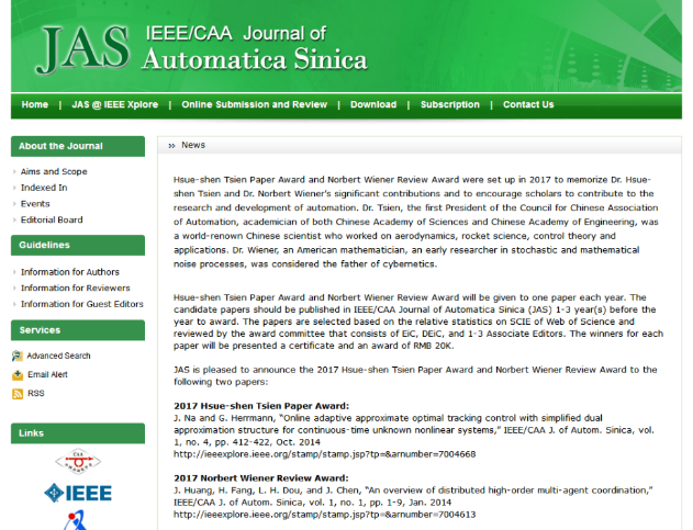 编辑:张男 审核:金军 阅读次数:日前,IEEE/CAA Journal of Automatica Sinica(JAS)公布了2017年首届“钱学森论文奖”和“维纳综述奖”获奖名单。北京成品人和一品二品的区别自动化学院陈杰院士团队的学术论文《An overview of distributed high-order multi-agent coordination》获得“维纳综述奖”。