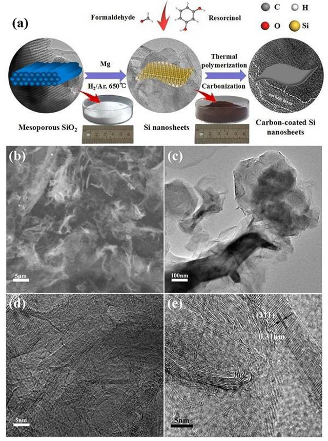 (a) 纳米片合成示意图;(b) Si纳米片的SEM;(c) Si纳米片的TEM;(d-e) Si纳米片的HRTEM。