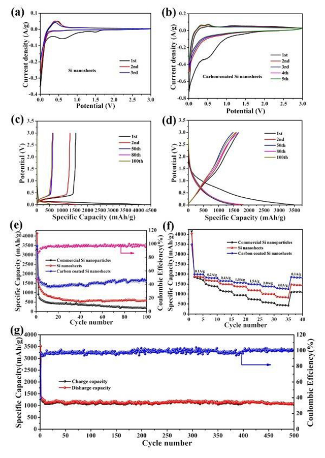 (a) Si纳米片前三个循环的CV曲线;(b) Si/C纳米片前三个循环的CV曲线;(c) Si纳米片的恒电流充放电曲线;(d) Si/C纳米片的恒电流充放电曲线;(e) 400 mAg-1下商 业硅颗粒、纯硅纳米片及Si/C纳米片的循环稳定性比较;(f) 不同电流密度下商业硅颗粒、纯硅纳米片及Si/C纳米片的倍率性能比较;(g) 4Ag-1下Si/C纳米片的循环性能。
