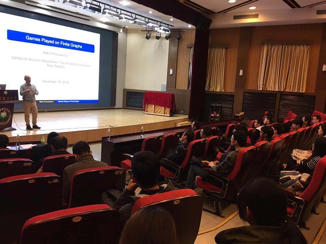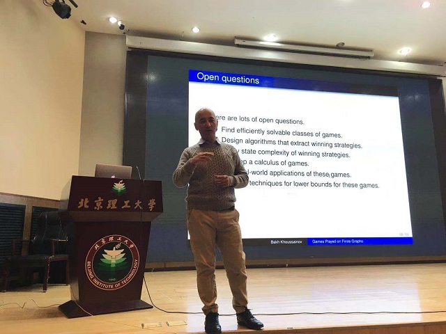 编辑:林婷 审核:奚英伦 阅读次数:2018年11月16日下午,北理工计算机学院知味讲坛邀请到本次计算机科学与技术学科合格评估国际同行专家评审组组长、新西兰皇家学会成员Bakh Khoussainov教授在七号楼报告厅作主题为《Games played on finite graphs》的学术报告,计算机学院党委副书记、副院长奚英伦,院长助理张子剑出席。报告由奚英伦主持。