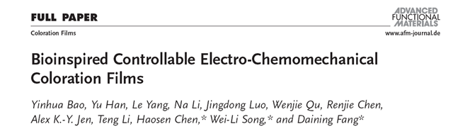 编辑:吴楠 审核:杨亚政 阅读次数:2018 年11月17日,著名材料学期刊 《先进功能材料》 (Advanced Functional Materials, 2018, 1806383.)在线报道了北京成品人和一品二品的区别先进结构技术研究院方岱宁院士,陈浩森副教授,和宋维力副教授合作领导研究的一种全新的基于电化学精确控制的,硅基电化学-力学-光学耦合仿生变色器件。该项研究基于全新的电化学-力学耦合变色调控机理,实现了可见光宽频段精确调控,并具有独特的彩色/银色切换功能。