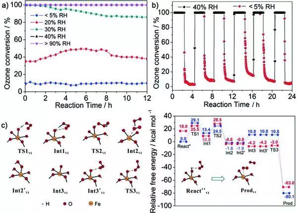 (a)分别在<5%RH、20%RH、30%RH、40%RH和> 90%RH下MIL-100(Fe)的臭氧转化率。b)在交替相对湿度下MIL-100(Fe)上的臭氧转化率。c)优化了在MIL‐100(Fe)催化臭氧分解过程中沿路径稳定点的结构和相应的势能曲线。蓝色和红线分别表示六重态和四重态MIL-100(Fe)氢氧化物复合物的能级。实验条件:用0.27g石英砂稀释0.03g催化剂, C( O3)= 45ppm,流速="1000mL" min-1,RH="45%,室温。)