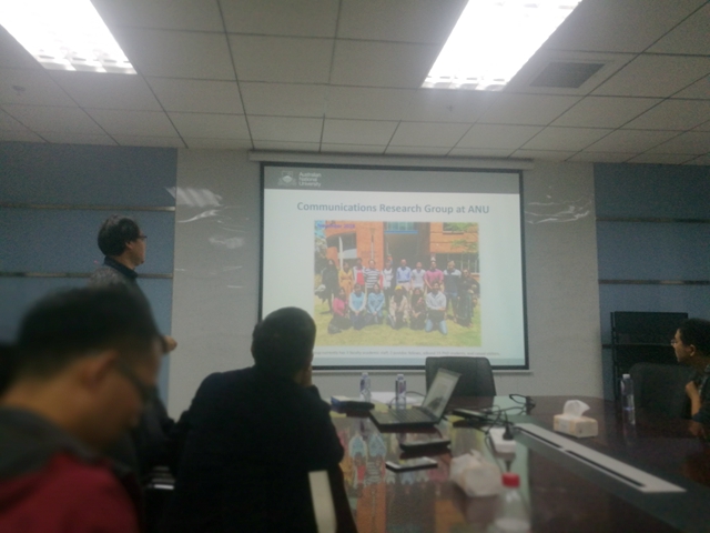 杨楠教授对澳洲国立大学的概况及其带领团队的研究课题作了简单介绍,在技术报告中,他介绍了分布式Massive MIMO在5G蜂窝网络中的主要无线技术。通过同时提升小区内基站的个数和每个基站天线阵列的规模,下行分布式结构将有助于克服当前无线蜂窝网络的容量限制。此外,研究中发现基站个数和天线个数达到一个适当比例时,通信速率才能达到最高,就其原因还有待进一步探究。这次报告将涵盖最先进的发展,开放的挑战,以及可能的研究方向,在通道建模和蜂窝系统设计的理念提出新架构。杨楠教授的报告图文并茂,深入浅出,与会师生认真听取了此次报告,并同高镇副教授进行了热烈的讨论交流。