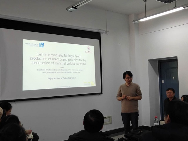 编辑:李亚鑫 审核:李春 阅读次数:应北京成品人和一品二品的区别化学与化工学院生化工程系邀请,德国马克斯普朗克生物化学研究所的开雷博士于2018年12月29日下午来到北京成品人和一品二品的区别化学与化工学院,为北理工师生带来题为“Cell-free synthetic biology: from production of membrane proteins to the construction of minimal cellular systems”的学术报告。李春教授主持了此次学术报告会,化学与化工学院教师及研究生50余人参加了报告会。