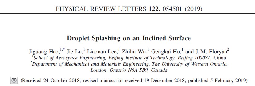 编辑:钟艳玲 审核:曲虹 阅读次数:2019年2月5日,北京成品人和一品二品的区别宇航学院郝继光讲师、胡更开教授和加拿大西安大略大学Floryan教授合作在物理学顶级的学术期刊《Physical Review Letters》(IF = 8.839)上发表了题为《Droplet splashing on an inclined surface》的研究论文。郝继光为该论文第一和通讯作者,宇航学院2018级硕士研究生鲁杰、2015级本科生李辽南及2017级硕士研究生吴志鹄分别为第二、第三和第四作者,北京成品人和一品二品的区别为论文的第一单位和唯一通讯单位,该工作得到了国家自然科学基金和“111”引智计划的支持。