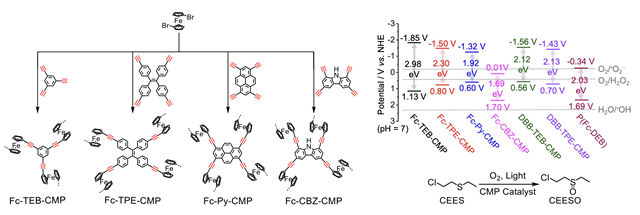 水污染等环境问题是当今社会面临的一大挑战,通过光催化反应对污染物进行高级氧化降解有望成为一种更加高效、节能的污染物处理方法。王博、冯霄团队通过三键聚合反应构筑了系列基于二茂铁基元的共轭微孔聚合物(Fc-CMPs)用于有毒有害物质降解研究。Fc-CMPs具有较大的孔径和比表面积,使得污染物容易进入孔道进行预富集并可充分接近易发生氧化还原反应的内表面,同时Fc-CMPs合适的分子轨道能级使得这类材料可高效产生活性氧物种。在可见光和模拟太阳光下,Fc-CMPs光催化降解亚甲蓝的能力均优于二氧化钛 (P25),并且能够将化学战剂芥子气模拟物(2-氯乙基乙基硫醚)完全转化为无毒产物。该研究工作发表在德国应用化学上( Angew. Chem. Int. Ed. , 2019, DOI: 10.1002/anie.201813598),文章第一作者为博士生马丽,通讯作者为王博和冯霄。