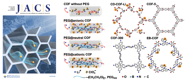 在前期工作中( Angew. Chem. Int. Ed., 2017, 56 , 16313,第一作者为博士生张媛媛,通讯作者为冯霄),该团队曾成功开发出基于环糊精的三维共价有机骨架材料(CD-COFs),该系列COFs为首次利用柔性基元构筑的具有 rra 拓扑学结构并通过离子型硼元素连接的三维COFs材料。其中,CD-COF-LiÉLiPF6-EC-DMC的室温锂离子电导率可以达到2.7 mS cm-1。然而,其中残留的微量电解液可能会在实际应用过程中带来一定的安全隐患。为解决这一问题,该团队将低分子量聚乙二醇(PEG)装载入COF孔道中加速锂离子传导,制备出没有溶剂残留的全固态电解质,并系统性研究了COF骨架电荷对于锂离子传导行为的影响,实现大于0.6的锂离子迁移数以及120 °C 下1.8 mS cm−1的离子传导速率。这一简单的通过担载PEG加速离子传导并提高工作温度范围的策略为将多孔材料进一步应用于全固态电池领域提供了可能。该研究工作发表在美国化学会志上,并被选为封面文章( J. Am. Chem. Soc. , 2019, 141, 1923),文章第一作者为硕士生郭振彬和博士生张媛媛,通讯作者为王博和冯霄。