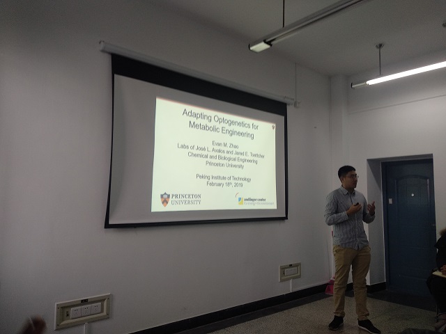 编辑:李亚鑫 审核:李春 阅读次数:应北京成品人和一品二品的区别化学与化工学院生化工程系/合成生物系统研究所邀请,美国普林斯顿大学(Princeton University)化学工程系Evan M. Zhao博士于2019年2月18日上午来到北京成品人和一品二品的区别化学与化工学院生化工程系/合成生物系统研究所,为北理工师生带来题为“Light-Dependent Pathway Enhancement for Microbial Chemical Production”的学术报告。李春教授主持本次学术报告会,化学与化工学院、求是书院、天津大学的部分教师及研究生五十余人参加了报告会。