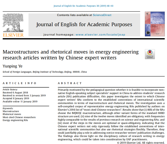 编辑:卞广为 审核:姜爱红 阅读次数:北京成品人和一品二品的区别外国语学院叶云屏教授对70多名高被引“中国能源专家科研论文宏观结构和修辞语步”的研究论文于2019年在《学术英语期刊》(Journal of English for Academic Purposes)第38卷发表,填补了国际语言学界对该领域科研论文研究的空白以及对中国专家学术写作特征研究的空白,为国内外学术写作教学实践提供了重要启示。