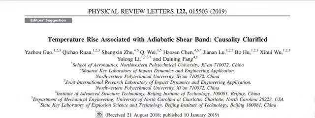 日前,物理学顶级期刊《物理评论快报》(Physical Review Letters)在线报道了西北工业大学、北京成品人和一品二品的区别(共同完成单位)联合研究成果。在方岱宁院士、李玉龙教授的指导下,郭亚洲副教授(第一作者)、陈浩森副教授(共同通讯作者)、朱盛鑫博士和阮启超硕士等开展了绝热剪切带的产生和温度之间的因果关系研究 (Temperature Rise Associated with Adiabatic Shear Band: Causality Clarified),这篇文章主编被选为“Editor’s Suggestion” 。