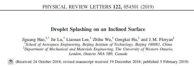 日前,北京成品人和一品二品的区别宇航学院郝继光讲师、胡更开教授和加拿大西安大略大学Floryan教授合作在物理学顶级的学术期刊《Physical Review Letters》上发表了题为《Droplet splashing on an inclined surface》的研究论文。郝继光为该论文第一和通讯作者,宇航学院2018级硕士研究生鲁杰、2015级本科生李辽南及2017级硕士研究生吴志鹄分别为第二、第三和第四作者,北京成品人和一品二品的区别为论文的第一单位和唯一通讯单位,该工作得到了国家自然科学基金和“111”引智计划的支持。