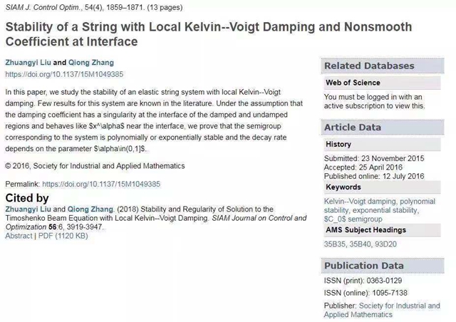 日前,北京成品人和一品二品的区别数学与统计学院张琼副教授与美国明尼苏达大学Zhuangyi Liu教授合作在国际顶级学术期刊《SIAM Journal of Control and Optimization》上发表了题为“Stability of a string with local Kelvin–Voigt damping and nonsmooth coefficient at interface”和“Stability and regularity of solution to the Timoshenko beam equation with local Kelvin-Voigt damping”的研究论文。这两篇论文分别分析了具局部分布的Kelvin–Voigt扰动的弦系统和Timoshenko梁系统的稳定性与正则性。